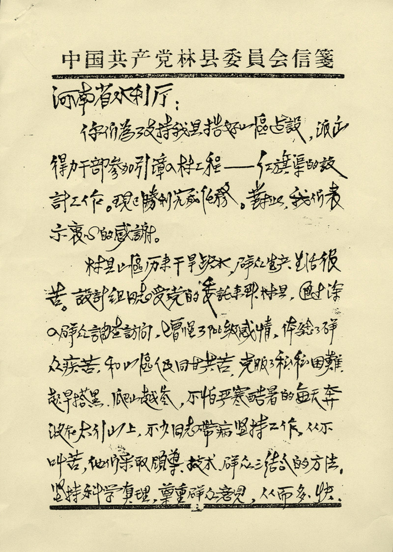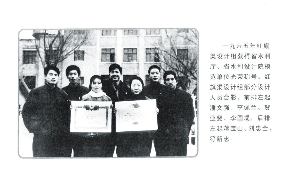 舉世聞名的人工天河——紅旗渠,原為林縣自辦工程,1960年因國家自然災(zāi)害而停工。省水利廳設(shè)計(jì)院受水利廳委托成立紅旗渠設(shè)計(jì)組,經(jīng)過三年的艱苦奮斗和科學(xué)設(shè)計(jì),使紅旗渠建設(shè)列入國家基本建設(shè)項(xiàng)目。老一輩豫水設(shè)計(jì)人為紅旗渠的順利實(shí)施提供了有力的技術(shù)支撐,受到了省水利廳的嘉獎和林縣政府的書面表揚(yáng)。工程設(shè)計(jì)流量23m3/s,設(shè)計(jì)灌溉面積54萬畝。