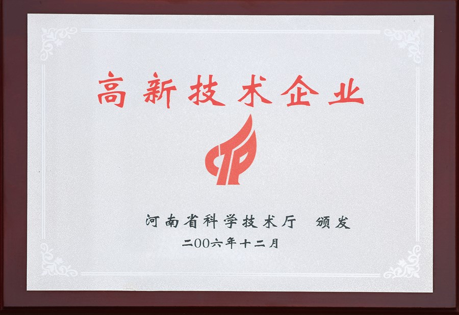 河南省科學(xué)技術(shù)廳頒發(fā) 高新技術(shù)企