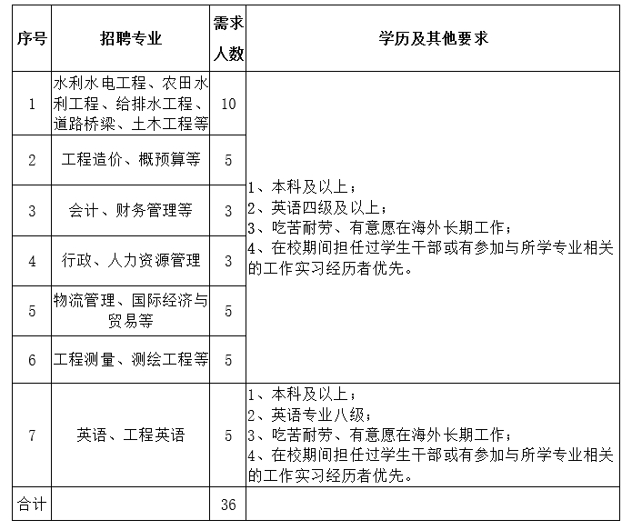 公司集工程勘測(cè)、設(shè)計(jì)、施工于一體,業(yè)務(wù)涵蓋水利水電、路橋、小型機(jī)場(chǎng)、輸變電、火電、風(fēng)電、光伏發(fā)電等多個(gè)工程領(lǐng)域,業(yè)務(wù)范圍遍及亞非多個(gè)國(guó)家和地區(qū)。為了響應(yīng)國(guó)家“走出去”戰(zhàn)略,不斷鞏固和拓展海外市場(chǎng),公司決定在2020年度招聘一批不同專業(yè)的優(yōu)秀大學(xué)畢業(yè)生來(lái)充實(shí)公司的海外團(tuán)隊(duì)。