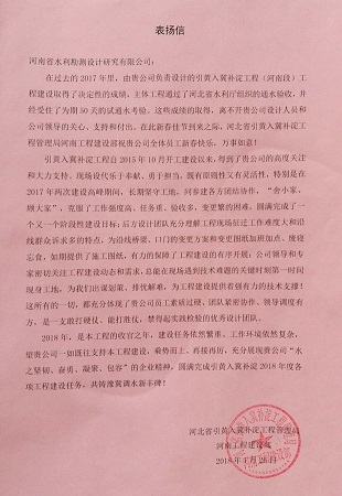1月29日上午,引黃入冀補(bǔ)淀工程建管局河南工程建設(shè)部發(fā)來表揚(yáng)信,對我公司在工程建設(shè)期間的貢獻(xiàn)表示感謝,并對設(shè)代人員的工作給予了高度肯定。