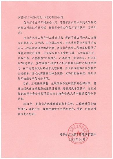 1月23日,公司收到河南省出山店水庫(kù)建設(shè)管理局發(fā)來(lái)的感謝信,對(duì)公司在工程建設(shè)中作出的貢獻(xiàn)表示感謝。