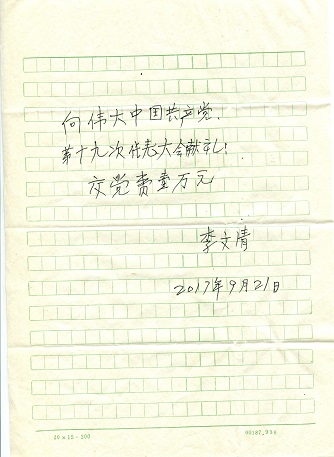 李文清同志,女,1929年5月出生,1952年參加工作以來(lái),不論在什么工作單位和工作崗位,始終勤勤懇懇。任勞任怨,干一行愛一行,干好一行,多次被評(píng)為先進(jìn)工作者。 1980年8月到河南省水利勘測(cè)設(shè)計(jì)院任會(huì)計(jì),她認(rèn)真負(fù)責(zé),待人熱情,服務(wù)周到,受到同事的好評(píng)。她積極要求進(jìn)步,1956年就向黨組織遞交了入黨申請(qǐng)書,幾十年矢志不渝,1990年12月退休后,她堅(jiān)持理想信念,孜孜不倦的追求,于1995年3月光榮入黨。入黨后,她始終在政治上同黨中央保持高度一致,堅(jiān)信只有中國(guó)共產(chǎn)黨才能帶領(lǐng)全國(guó)各族人民走中國(guó)特色社會(huì)主義道路,實(shí)現(xiàn)全面小康和國(guó)家富強(qiáng)。她關(guān)心國(guó)家大事,關(guān)心單位發(fā)展,深感為黨工作太少,為了表達(dá)對(duì)黨的深厚感情,2011年“七一”前夕,為慶祝建黨90周年,一次性向組織交納黨費(fèi)9999元;2016年6月16日,她用樸實(shí)無(wú)華的語(yǔ)言給黨組織寫了“我要給偉大的中國(guó)共產(chǎn)黨過生日”,向組織繳納黨費(fèi)2000元;2017年9月22日,在黨的十九大即將召開之際,88歲高齡的她平時(shí)省吃儉用,又一次從每月3000多元的退休金里積攢了10000元作為特殊黨費(fèi),向黨的十九大獻(xiàn)上自己的一份厚禮,祝賀黨的十九大勝利召開,祝愿我們的黨在以習(xí)近平同志為核心的黨中央集體領(lǐng)導(dǎo)下,實(shí)現(xiàn)兩個(gè)一百年的宏偉目標(biāo),實(shí)現(xiàn)偉大的中國(guó)夢(mèng)。