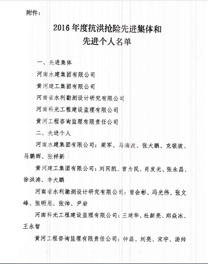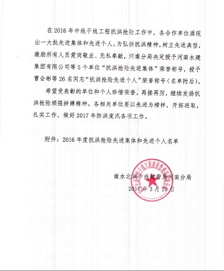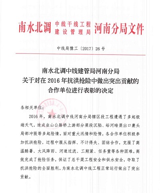 3月15日,南水北調中線干線工程建設管理局河南分局對在2016年抗洪搶險中做出突出貢獻的合作單位進行了表彰。我公司榮獲“2016年度抗洪搶險先進集體”稱號,曹會彬、馮光偉等6位同志獲得“2016年度抗洪搶險先進個人”稱號。表彰文件如下: