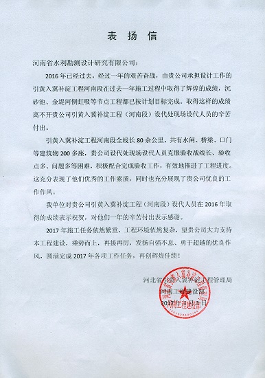 近日,公司收到引黃入冀補淀工程管理局河南工程建設部發(fā)來的熱情洋溢的表揚信,對公司為引黃入冀補淀工程2016年度建設工作的支持和配合表示衷心的感謝,對公司派駐現(xiàn)場設代2016年度的技術(shù)服務工作給予肯定,對設代人員頂風冒雪、放棄假日奮戰(zhàn)在工程建設第一線的辛勤付出充分認可,對豫水設計人的工作素質(zhì)和敬業(yè)精神提出了表揚,并希望設代人員在2017年的設代工作中再接再勵、續(xù)寫輝煌。