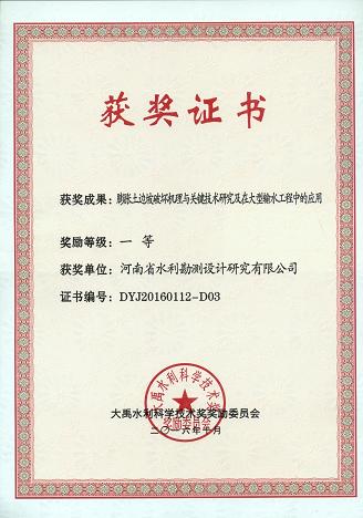 我公司在承擔(dān)南水北調(diào)中線工程的工程設(shè)計(jì)任務(wù)同時(shí),與長(zhǎng)江科學(xué)院、南水北調(diào)中線建設(shè)管理局共同承擔(dān)了《南水北調(diào)中線膨脹巖渠坡處理技術(shù)》等相關(guān)的國(guó)家“十一五”、“十二五”科技支撐計(jì)劃課題。在2016年度大禹水利科學(xué)進(jìn)步獎(jiǎng)的評(píng)選中,《膨脹土邊坡破壞機(jī)理與關(guān)鍵技術(shù)研究及在大型輸水工程中的應(yīng)用》科研成果榮獲一等獎(jiǎng),是公司目前所獲最高級(jí)別的獎(jiǎng)勵(lì)。