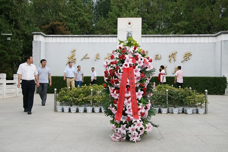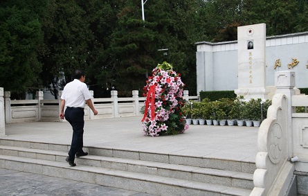 一進入蘭考縣城,紅色的黨旗,鮮明的文化標語,干凈整潔的裕祿大道,讓大家深深感受到焦裕祿對這個城市的影響,以及蘭考人民對他的愛戴。上午10時,在莊嚴肅穆的焦裕祿烈士墓前,支部書記曹德志同志,帶領(lǐng)黨員向革命烈士焦裕祿同志敬獻花籃,并向革命烈士三鞠躬。
