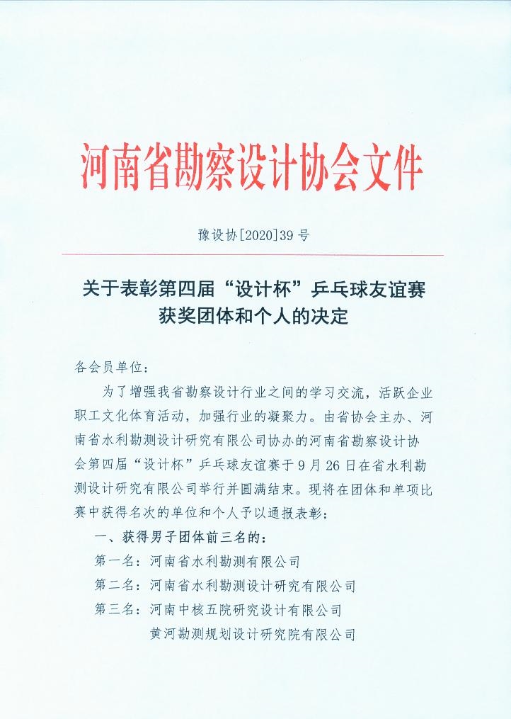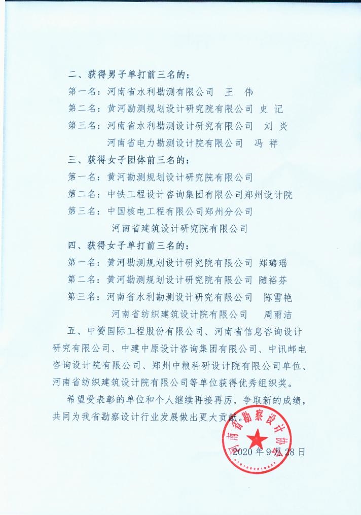 秋高氣爽,金桂飄香,為加強我省勘察設(shè)計行業(yè)職工的學(xué)習(xí)交流,活躍職工業(yè)余文化生活,增強行業(yè)的凝聚力,在雙節(jié)來臨之際,由河南省勘察設(shè)計協(xié)會主辦、我公司協(xié)辦的河南省勘察設(shè)計協(xié)會第四屆“設(shè)計杯”乒乓球友誼賽于2020年9月26日在我公司成功舉辦。