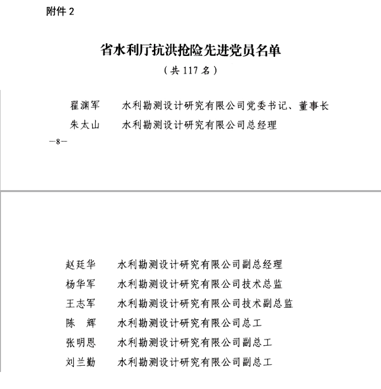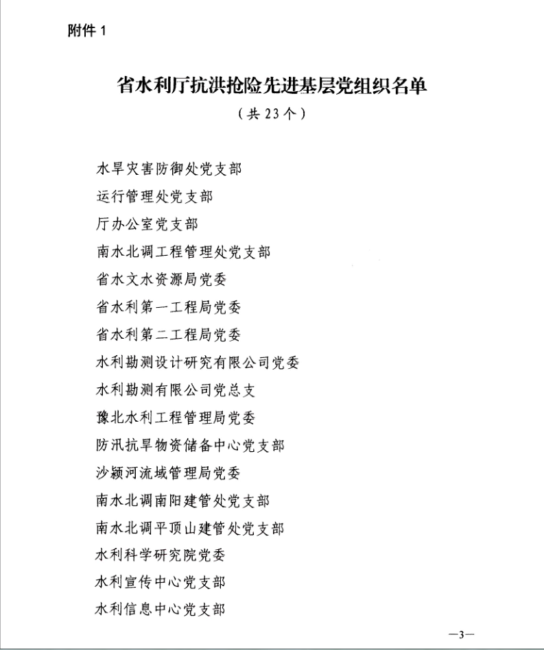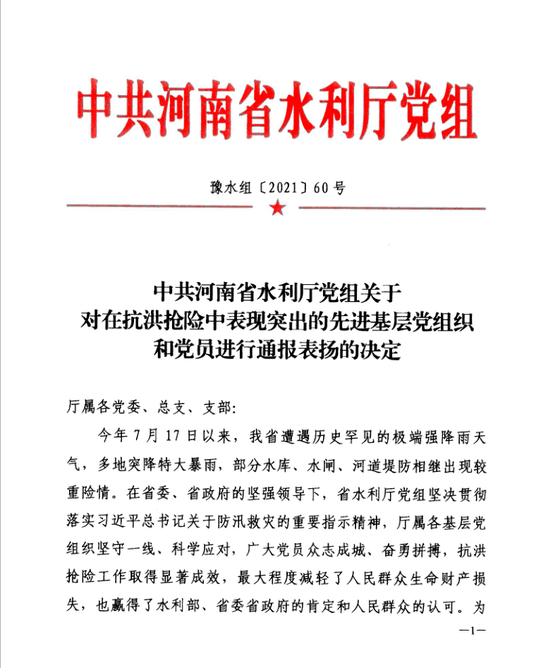8月9日,省水利廳黨組以豫水組【2021】60號(hào)文下發(fā)了《關(guān)于對(duì)在抗洪搶險(xiǎn)中表現(xiàn)突出的先進(jìn)基層黨組織和黨員進(jìn)行表彰的決定》,公司黨委作為省水利廳抗洪搶險(xiǎn)先進(jìn)基層黨組織,翟淵軍、朱太山、趙廷華、楊華軍、王志軍、陳輝、張明恩、劉蘭勤等8名黨員同志作為省水利廳抗洪搶險(xiǎn)先進(jìn)黨員受到通報(bào)表揚(yáng)。