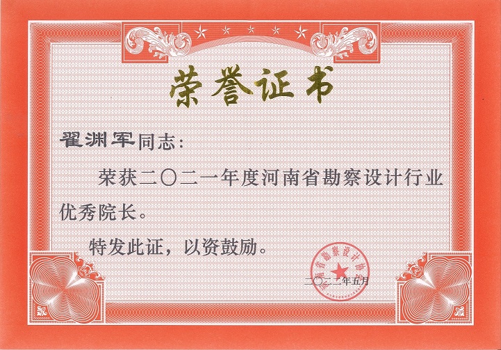 大會還對2021年表現(xiàn)優(yōu)秀的勘察設(shè)計企業(yè)、院長頒發(fā)了榮譽證書。公司被評為2021年度河南省勘察設(shè)計行業(yè)先進企業(yè),翟淵軍董事長榮獲2021年河南省勘察設(shè)計行業(yè)優(yōu)秀院長。