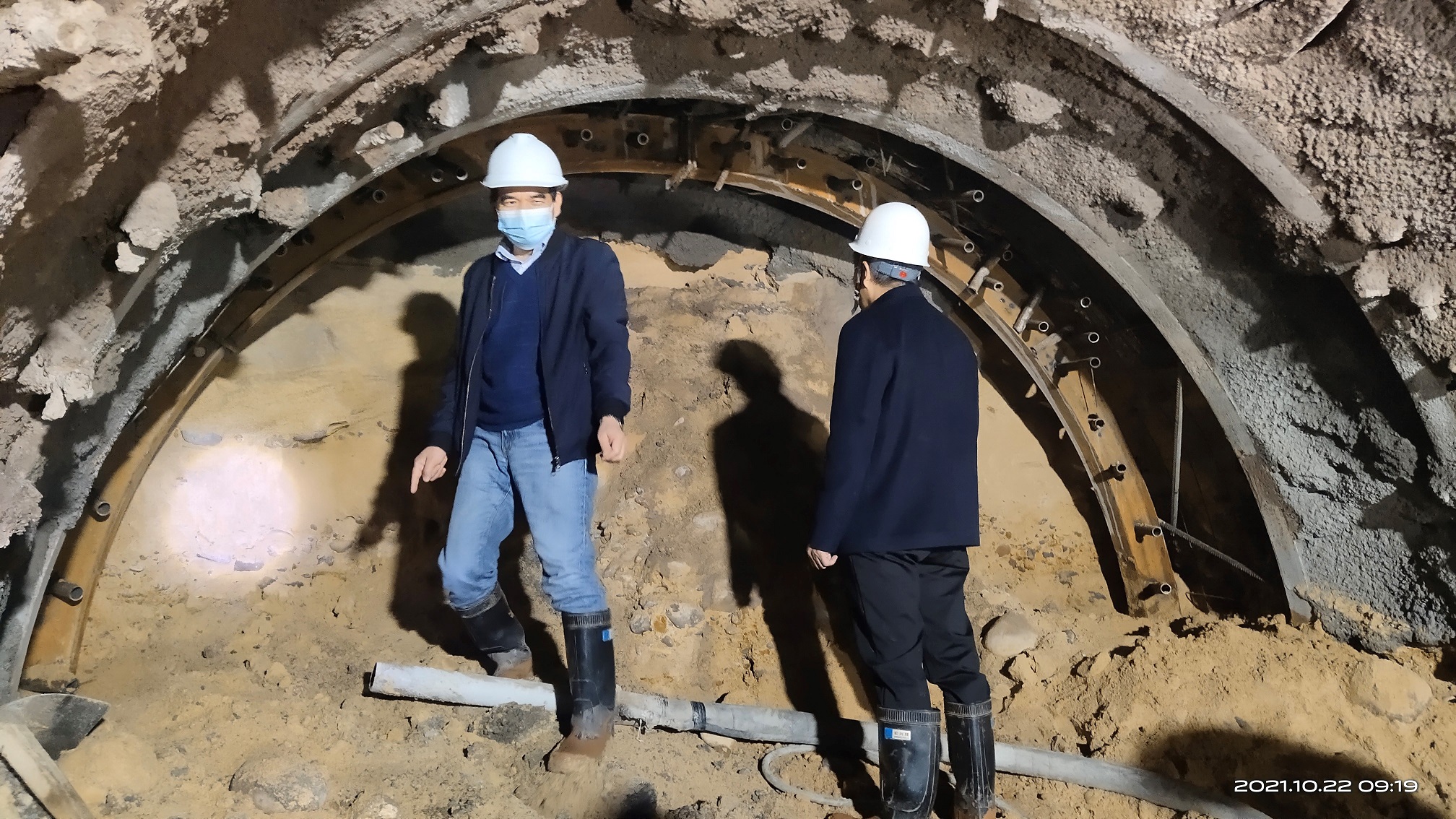 公司技術(shù)副總監(jiān)水淼(左)現(xiàn)場查看隧洞砂卵石地層坍塌問題