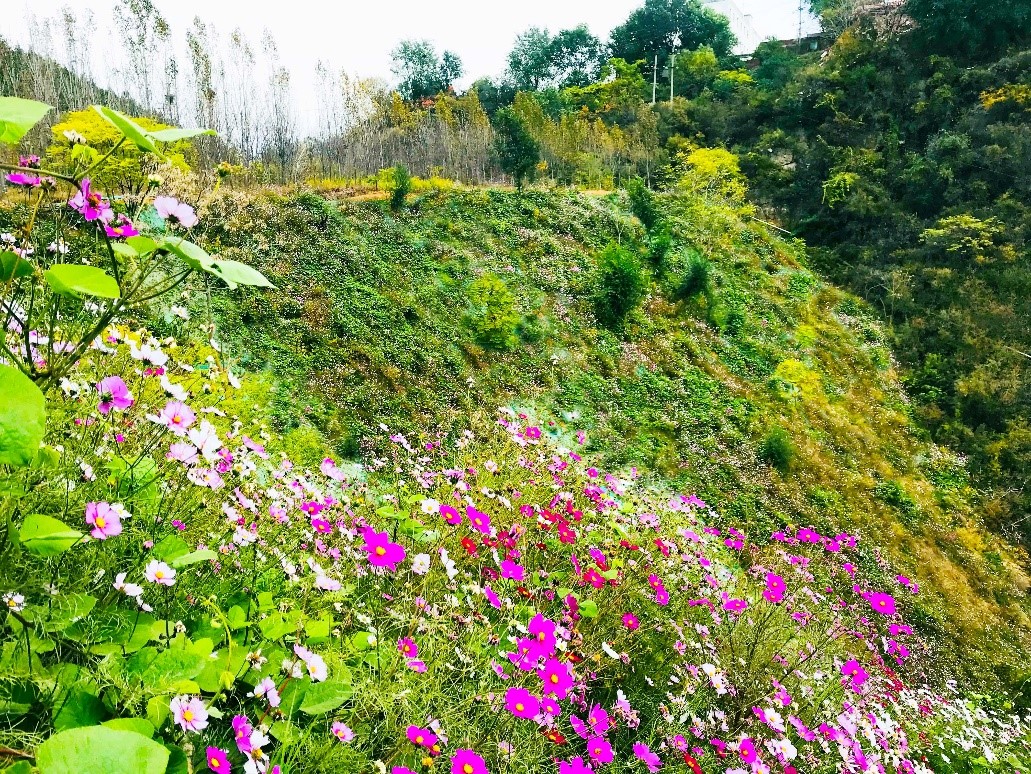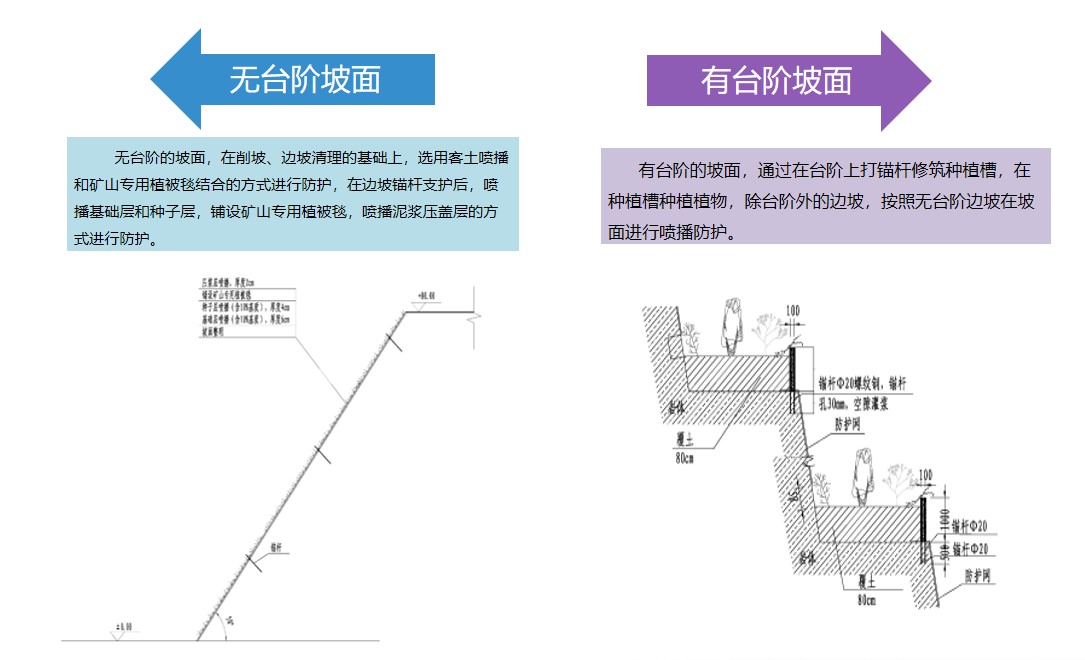 根據(jù)不同的邊坡型式,綜合采用消坡、排險、錨固、掛網(wǎng)、噴播、種植穴/槽等不同的技術(shù)措施,以及藤、灌、草等多種植物搭配組合,實現(xiàn)邊坡復(fù)綠與生境的自我修復(fù)和構(gòu)建。