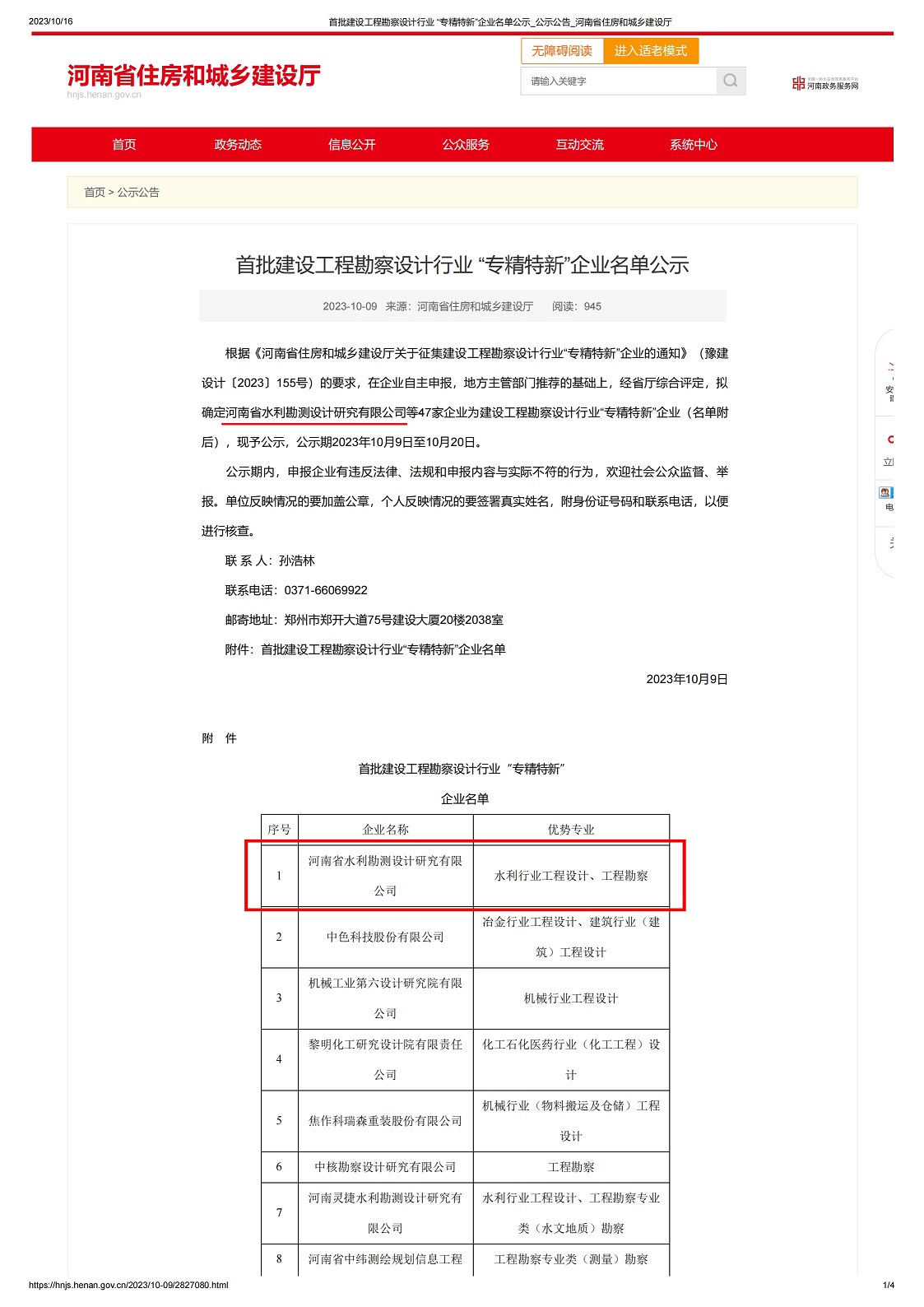 10月9日,河南省住建廳公示首批建設(shè)工程勘察設(shè)計(jì)行業(yè)專(zhuān)精特新企業(yè)名單,河南省內(nèi)僅47家勘察設(shè)計(jì)企業(yè)入選,我公司在眾多參評(píng)單位中脫穎而出,位列榜首。