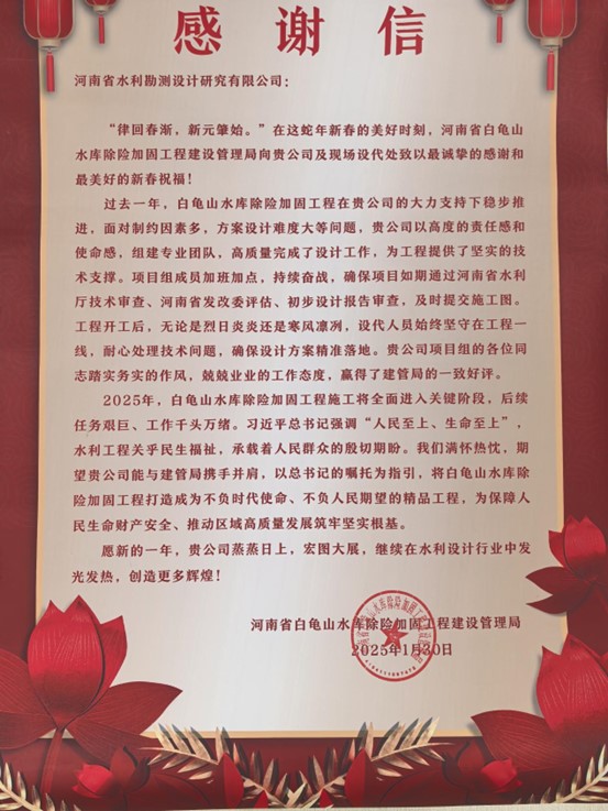 2月14日上午,河南省白龜山水庫除險加固工程建設(shè)管理局趙東城局長一行到訪公司,送來“精心設(shè)計鑄精品,團隊協(xié)作展風采”的錦旗和感謝信,以感謝公司在白龜山水庫除險加固工程前期審批及建設(shè)期間的傾力付出。