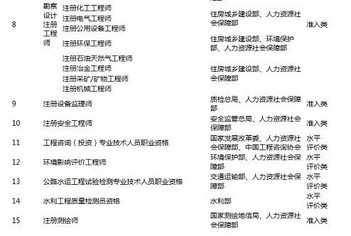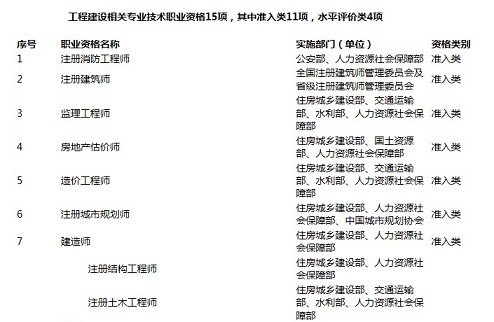 與工程建設(shè)相關(guān)的共22項,其中,專業(yè)技術(shù)人員職業(yè)資格15項,技能人員職業(yè)資格7項,具體見下表。