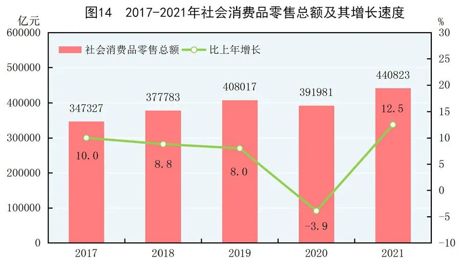 全年社會(huì)消費(fèi)品零售總額440823億元,比上年增長12.5%。按經(jīng)營地統(tǒng)計(jì),城鎮(zhèn)消費(fèi)品零售額381558億元,增長12.5%;鄉(xiāng)村消費(fèi)品零售額59265億元,增長12.1%。按消費(fèi)類型統(tǒng)計(jì),商品零售額393928億元,增長11.8%;餐飲收入額46895億元,增長18.6%。