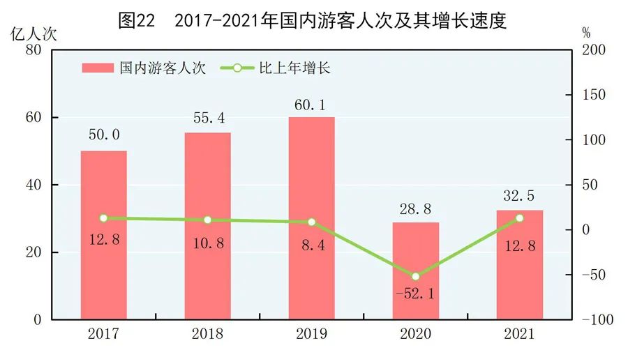 全年國內(nèi)游客32.5億人次,比上年增長12.8%。其中,城鎮(zhèn)居民游客23.4億人次,增長13.4%;農(nóng)村居民游客9.0億人次,增長11.1%。國內(nèi)旅游收入29191億元,增長31.0%。其中,城鎮(zhèn)居民游客花費(fèi)23644億元,增長31.6%;農(nóng)村居民游客花費(fèi)5547億元,增長28.4%。