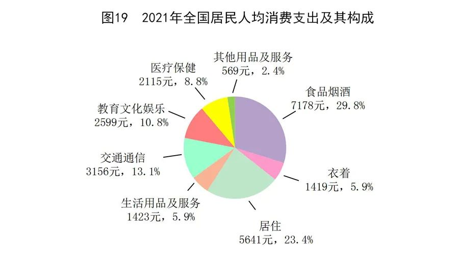 全年全國居民人均消費(fèi)支出24100元,比上年增長13.6%,扣除價(jià)格因素,實(shí)際增長12.6%。其中,人均服務(wù)性消費(fèi)支出10645元,比上年增長17.8%,占居民人均消費(fèi)支出的比重為44.2%。按常住地分,城鎮(zhèn)居民人均消費(fèi)支出30307元,增長12.2%,扣除價(jià)格因素,實(shí)際增長11.1%;農(nóng)村居民人均消費(fèi)支出15916元,增長16.1%,扣除價(jià)格因素,實(shí)際增長15.3%。全國居民恩格爾系數(shù)為29.8%,其中城鎮(zhèn)為28.6%,農(nóng)村為32.7%。