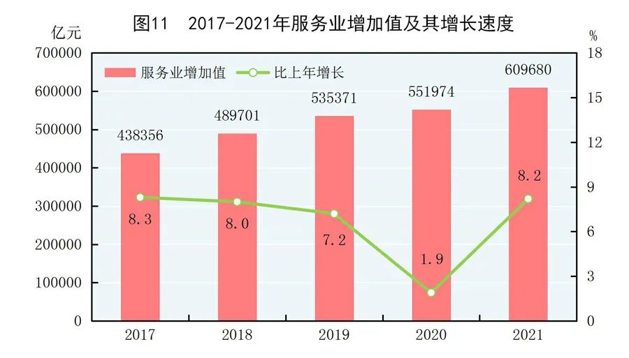 全年批發(fā)和零售業(yè)增加值110493億元,比上年增長11.3%;交通運(yùn)輸、倉儲(chǔ)和郵政業(yè)增加值47061億元,增長12.1%;住宿和餐飲業(yè)增加值17853億元,增長14.5%;金融業(yè)增加值91206億元,增長4.8%;房地產(chǎn)業(yè)增加值77561億元,增長5.2%;信息傳輸、軟件和信息技術(shù)服務(wù)業(yè)增加值43956億元,增長17.2%;租賃和商務(wù)服務(wù)業(yè)增加值35350億元,增長6.2%。全年規(guī)模以上服務(wù)業(yè)企業(yè)營業(yè)收入比上年增長18.7%,利潤總額增長13.4%。