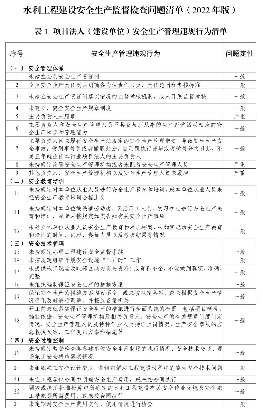 為進(jìn)一步強(qiáng)化水利工程建設(shè)領(lǐng)域安全生產(chǎn)監(jiān)督檢查,增強(qiáng)檢查的針對(duì)性、有效性和規(guī)范性,水利部監(jiān)督司組織對(duì)《水利工程建設(shè)安全生產(chǎn)監(jiān)督檢查問題清單(2021年版)》進(jìn)行修訂,形成了《水利工程建設(shè)安全生產(chǎn)監(jiān)督檢查問題清單(2022年版)》。