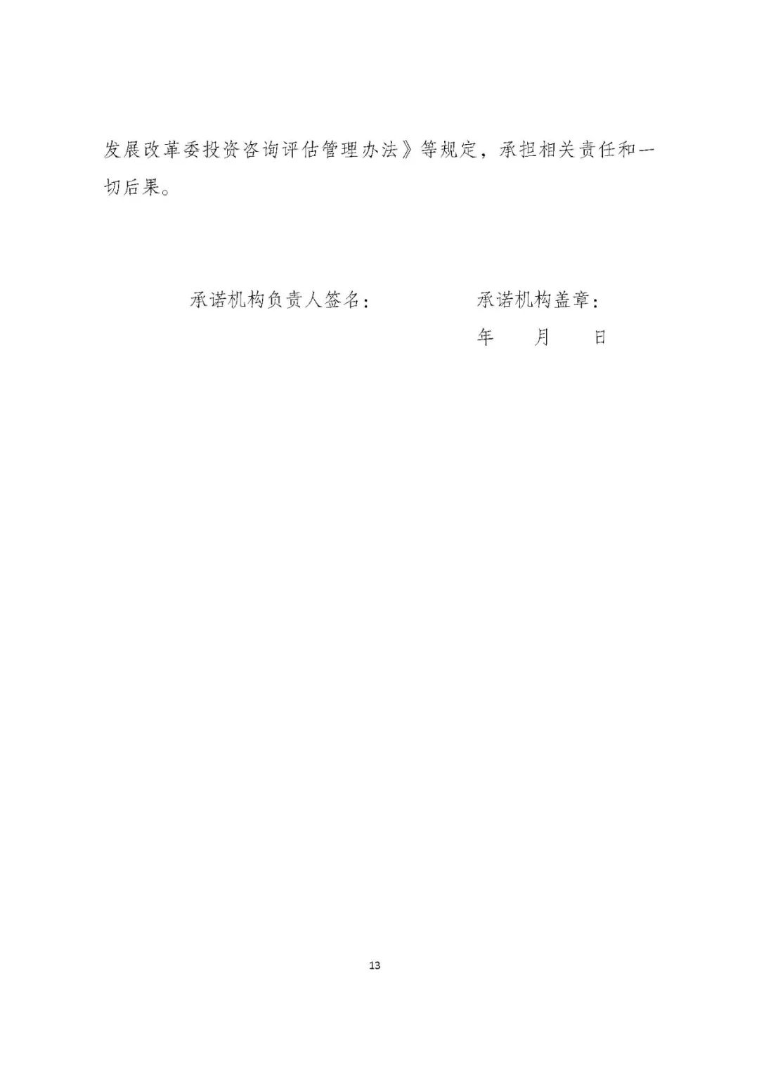第十八條咨詢評估機(jī)構(gòu)、參與咨詢評估相關(guān)工作人員應(yīng)當(dāng)按照規(guī)定格式簽訂承諾書,并報(bào)投資司存檔備查。咨詢評估機(jī)構(gòu)的承諾書由其法定代表人簽署、咨詢評估機(jī)構(gòu)蓋章,參與咨詢評估的相關(guān)工作人員承諾書由本人親筆簽署。