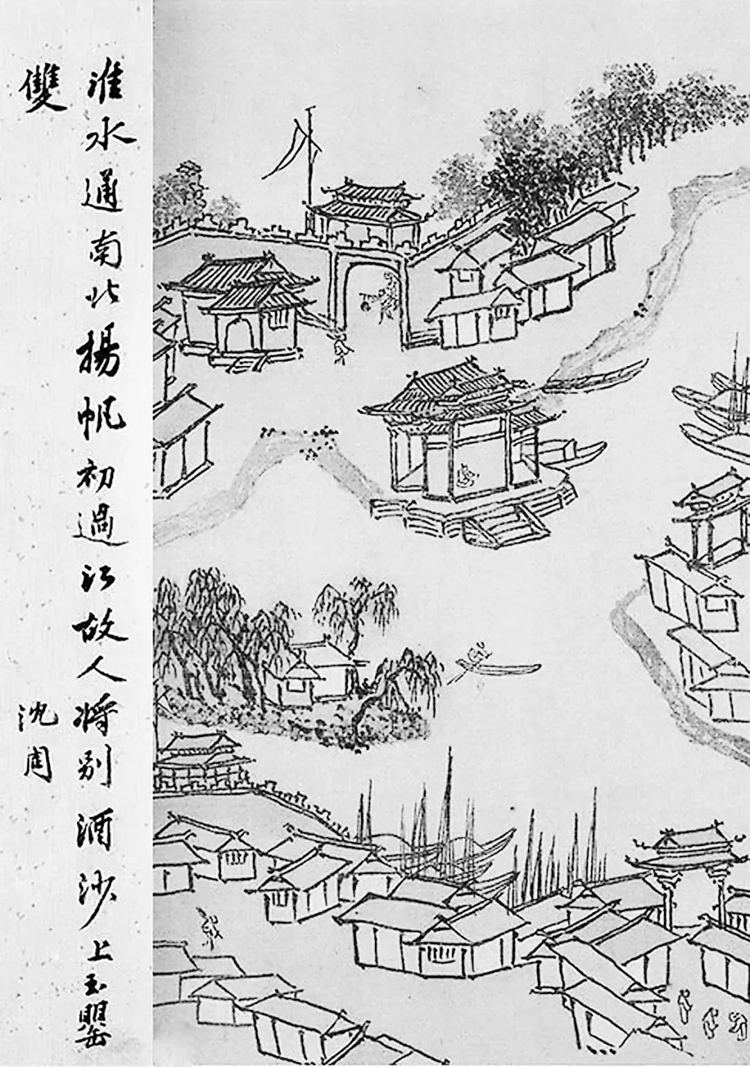 圖為明代畫家沈周的《兩江名勝圖冊》,題款:淮水通南北,揚帆初過江。故人將別酒,沙上玉罌雙。